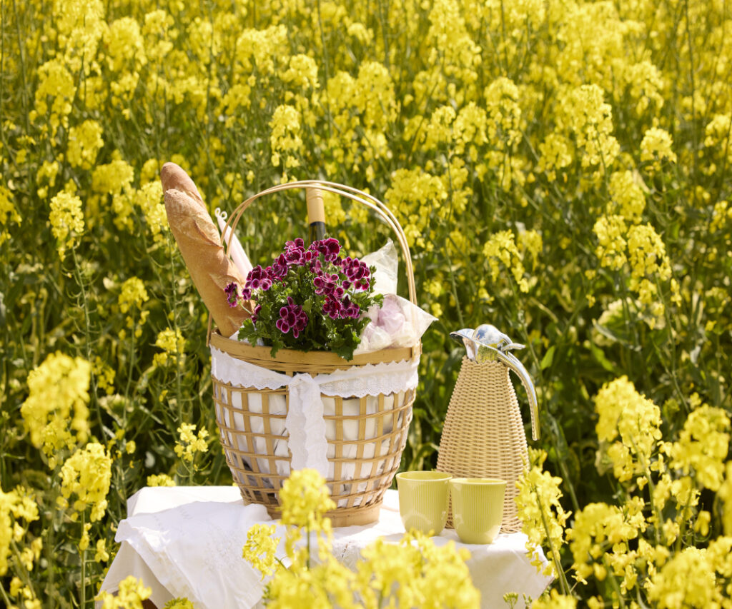 Een picknick tegen de achtergrond van een bloeiend koolzaadveld biedt de ultieme, authentieke natuurbeleving met alle zomerse charme. Met zorg gedekt met koffie, baguettes en fruit nodigt de picknicktafel links uit om te ontspannen en volop van het moment te genieten.