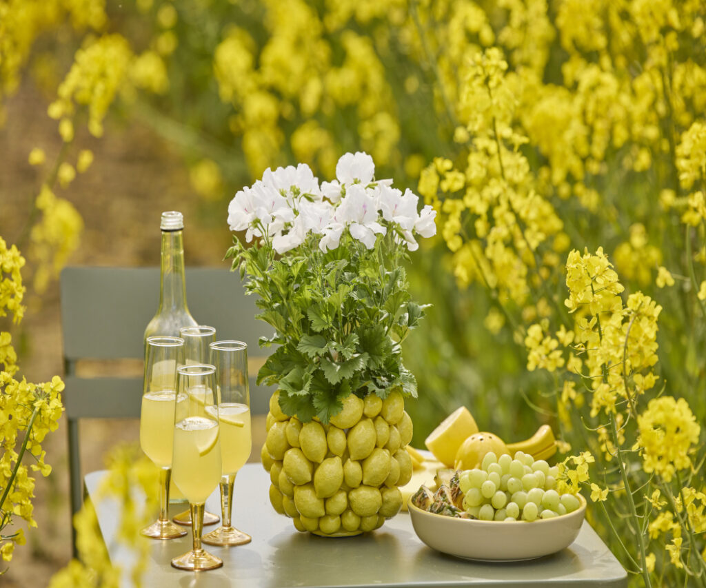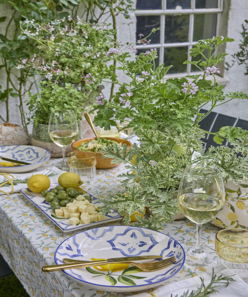 Hier verspreiden geurgeraniums hun frisse aroma’s en vormen ze samen met citroenen, olijven en witte wijn een zomerse tafelschikking die een feest is voor de zintuigenlicht, onbezorgd en vol mediterrane levensvreugde.