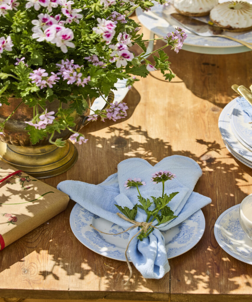 Mooie details maken het geheel af: een enkele geraniumsteel, losjes vastgebonden aan een lichtblauwe servet, voegt een bloemig accent toe aan de picknick en heet gasten hartelijk welkom.