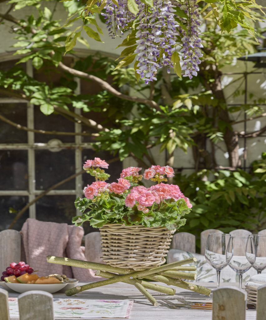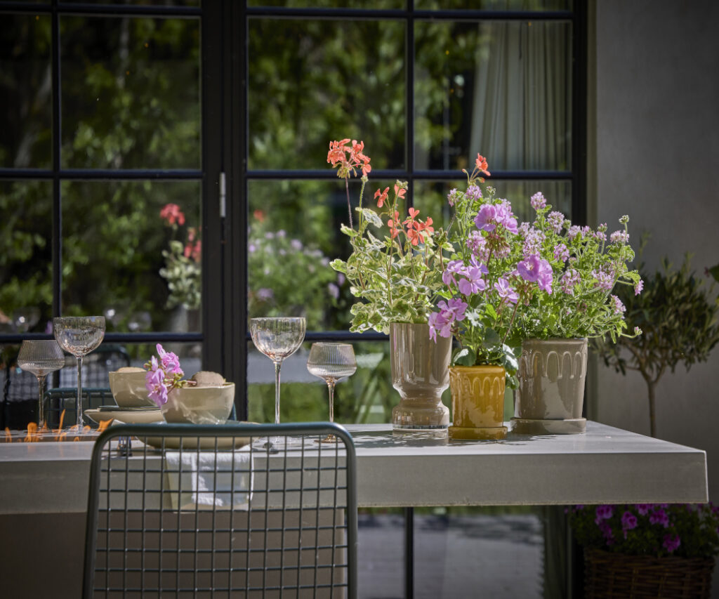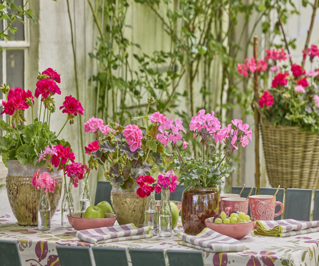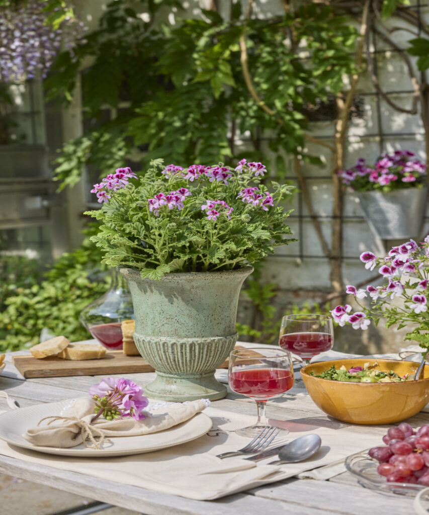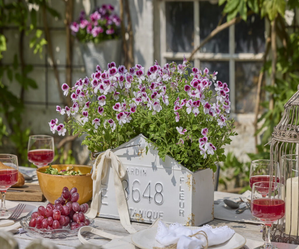 Bloeiende geurgeraniums komen prachtig tot hun recht in zinken of keramische potten in vintagestijl. Als opvallende blikvangers op tafel geven ze een romantisch accent aan het buiten dineren en brengen ze de zomer echt tot leven.