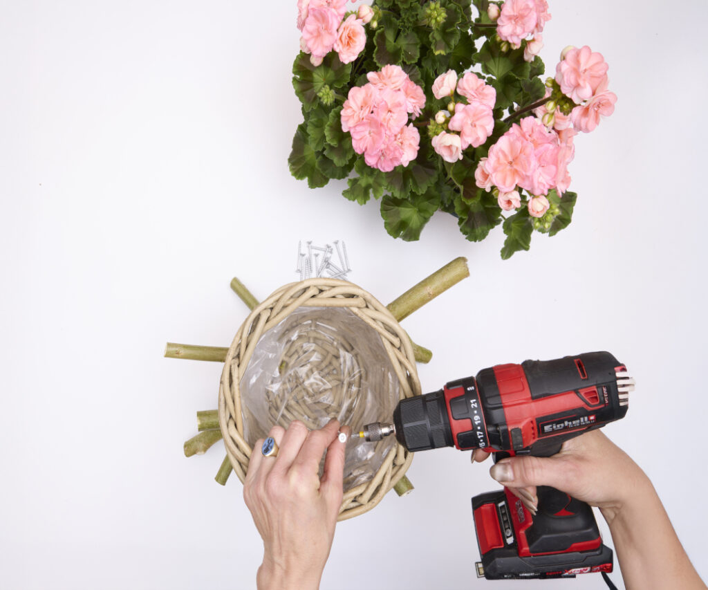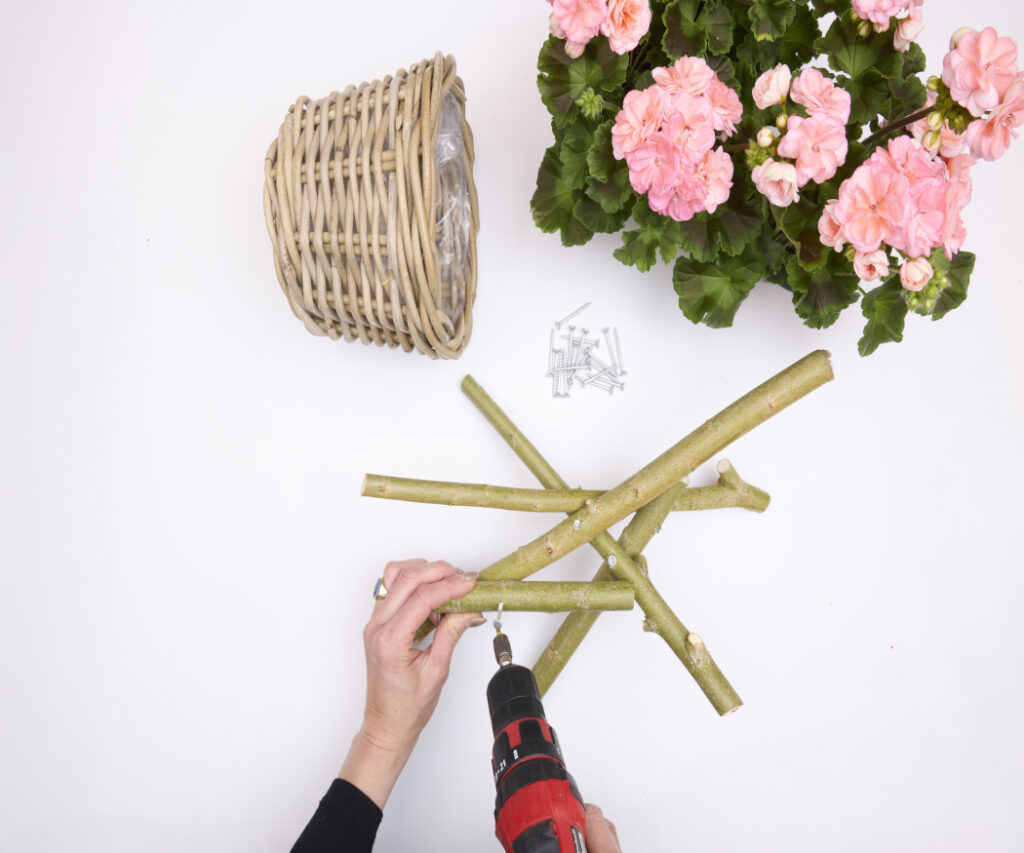 Stap 3: Bevestig de mand met schroeven aan de takken, zodat deze stevig op het frame rust. Plaats tot slot voorzichtig de bloeiende geranium in de mand en zet je zelfgemaakte bloemenstandaard op tafel. Zo creëer je een natuurlijk middelpunt dat direct de aandacht trekt.