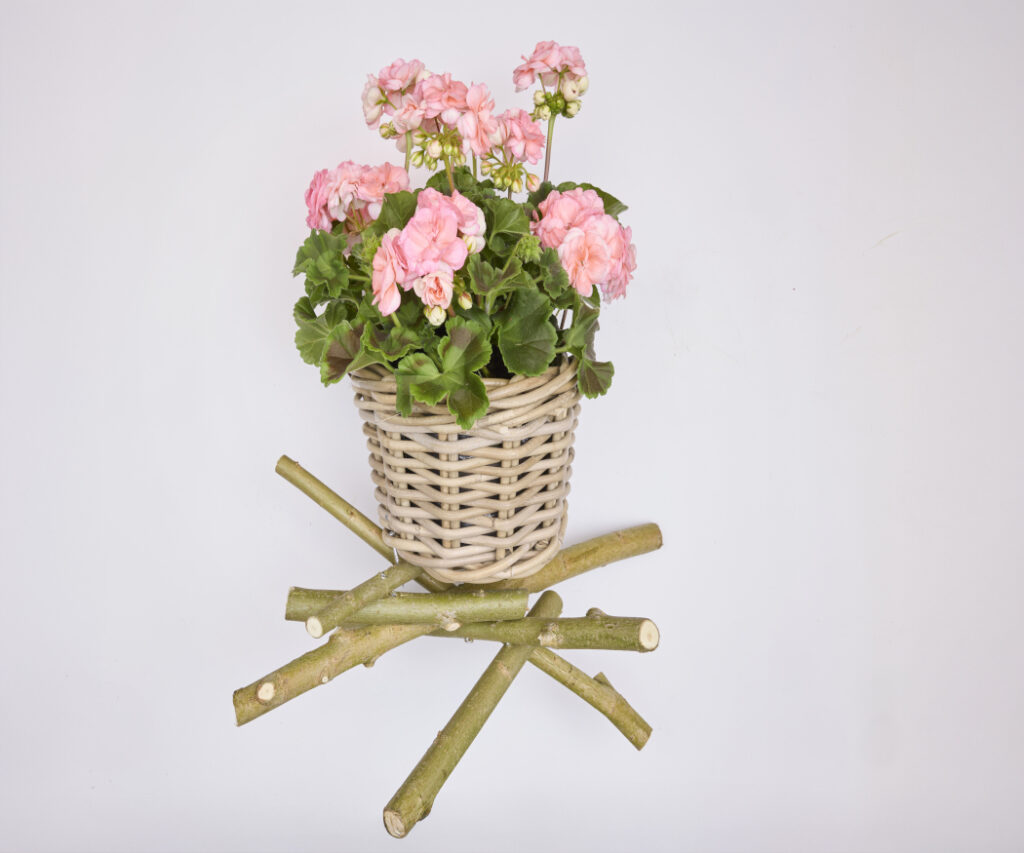 Kleurrijke geraniums komen prachtig tot hun recht in een zorgvuldig gemaakte bloemenstandaard van natuurlijke takken met een decoratieve mand als plantenbak. Dit opvallende, rustieke item geeft elke tafel een vrolijk kleuraccent en is bovendien heel eenvoudig zelf te maken.