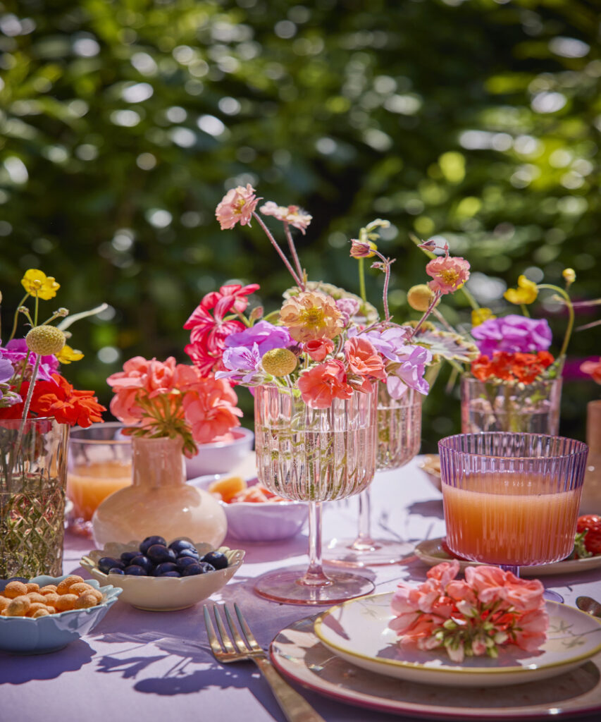 Kleurrijk, vrolijk en zomers: het arrangement links straalt pure levensvreugde uit en is perfect voor een tuinfeest.