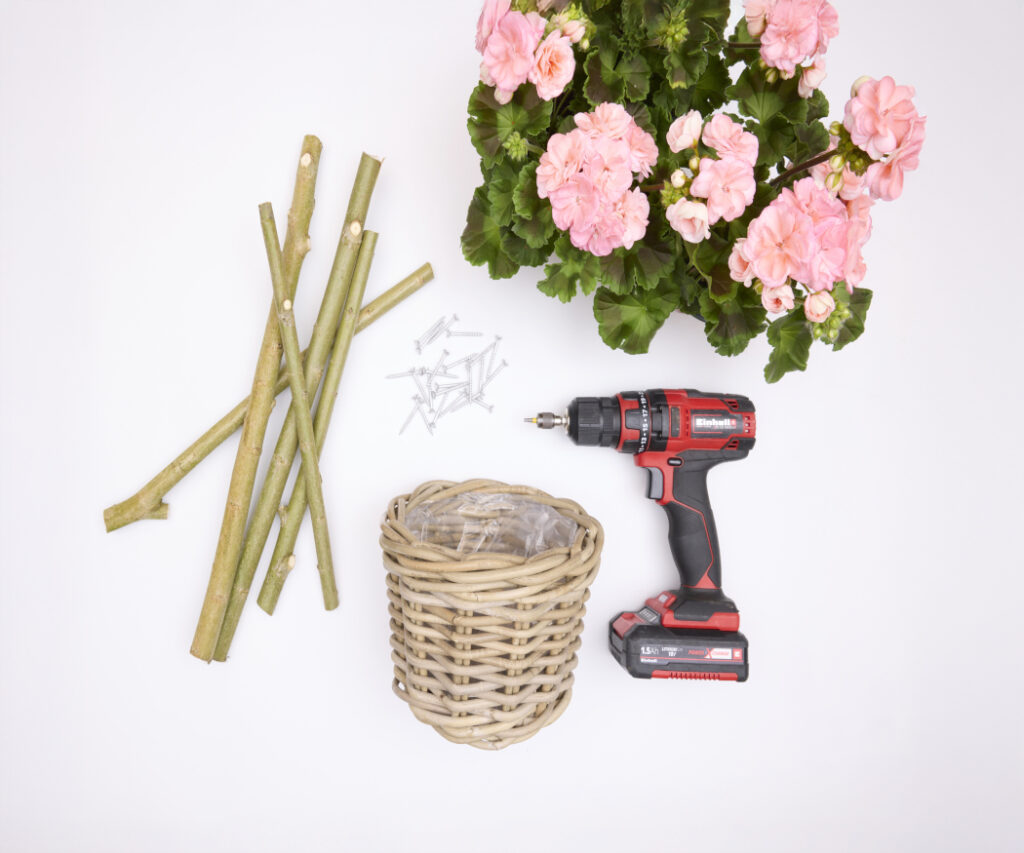 3 rechte takken van ca. 40 cm lang, 3 kortere takken van ca. 20 cm lang, een mand, een accuschroevendraaier, schroeven en een bloeiende geranium.